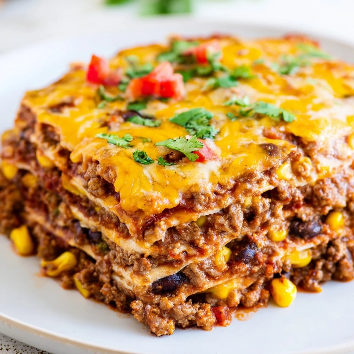 This hearty Tex-Mex casserole layers seasoned ground beef with onions, garlic, corn, and black beans between soft corn tortillas. Each layer gets generously covered with red enchilada sauce and a blend of sharp cheddar and Monterey Jack cheeses. After baking covered to meld the flavors, the dish finishes uncovered until the cheese turns golden and bubbly. Let it rest briefly before serving to ensure clean slices.