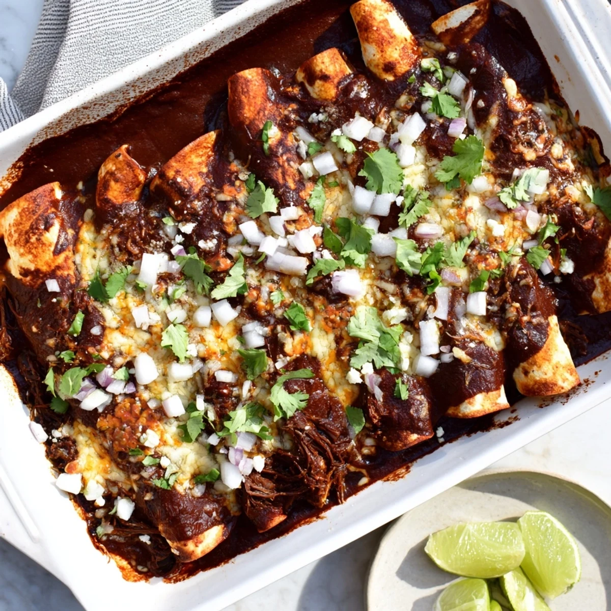 The birria beef actually tastes better the next day after the flavors have had time to mingle in the refrigerator. You can make the beef up to three days ahead, and even assemble the enchiladas the night before baking—just add a splash of extra consommé before they go into the oven since the tortillas will absorb some liquid overnight.