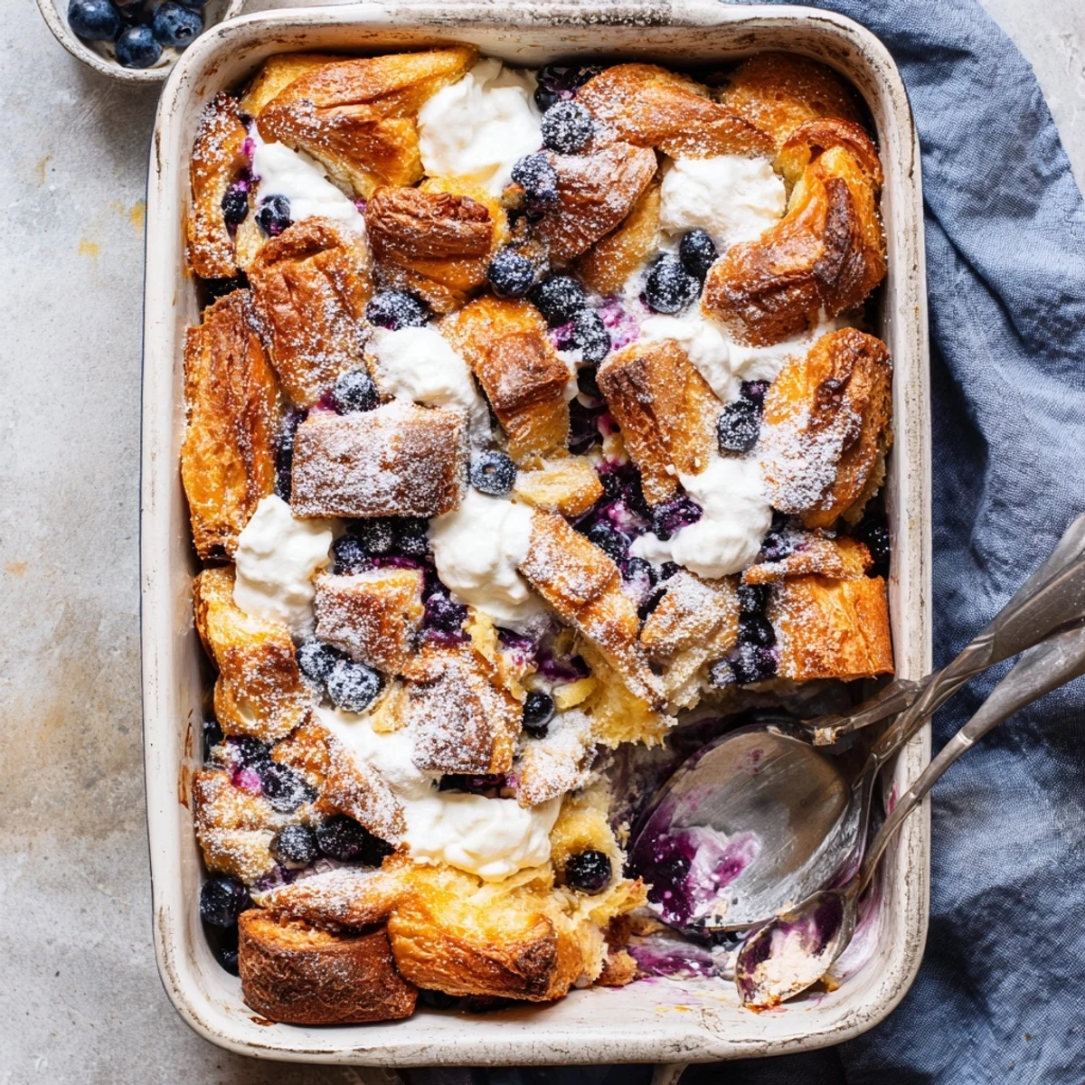 - Top with remaining croissant pieces and blueberries creating little pockets of fruit throughout