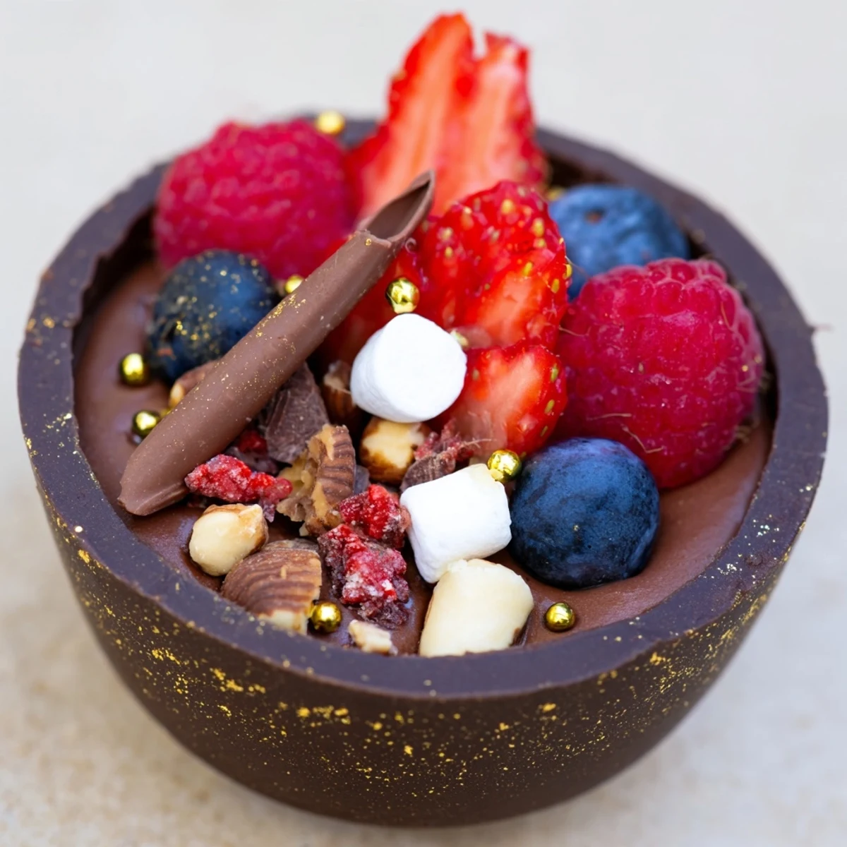 These sophisticated chocolate grazing cups feature handmade dark chocolate cups filled with silky chocolate mousse and topped with fresh mixed berries, crunchy nuts, mini marshmallows, and chocolate curls. The contrast between the crisp chocolate shell and velvety mousse creates an irresistible texture combination, while vibrant berries and garnishes add visual appeal to any dessert spread.
