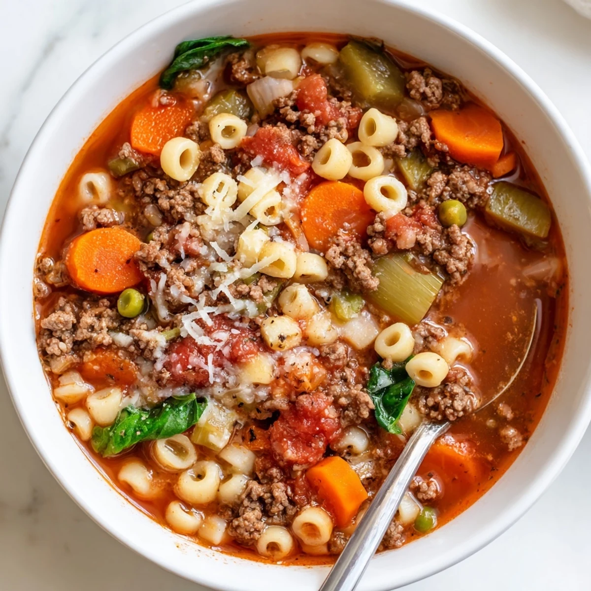 This one-pot comfort bowl starts by browning ground beef, then softening onions, carrots and celery in olive oil. Garlic and dried herbs build the base before adding diced tomatoes, tomato sauce and beef broth. Small pasta cooks directly in the simmering broth for about 10 minutes; peas and spinach are stirred in at the end. Finish with salt, pepper and grated Parmesan for a warm, satisfying meal ready in 45 minutes.