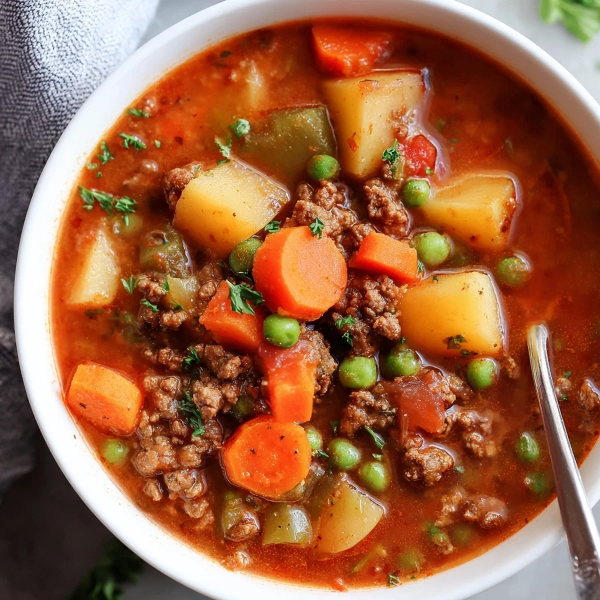 This hearty soup combines browned ground beef with tender russet potatoes, carrots, celery, and onions in a flavorful beef broth base. The addition of diced tomatoes, thyme, and smoked paprika creates depth, while frozen peas add sweetness and color. Ready in under an hour, this filling one-pot meal serves six and easily adapts to your taste—swap in ground turkey, add extra vegetables, or stir in cream for richness. Perfect with crusty bread on cold days.