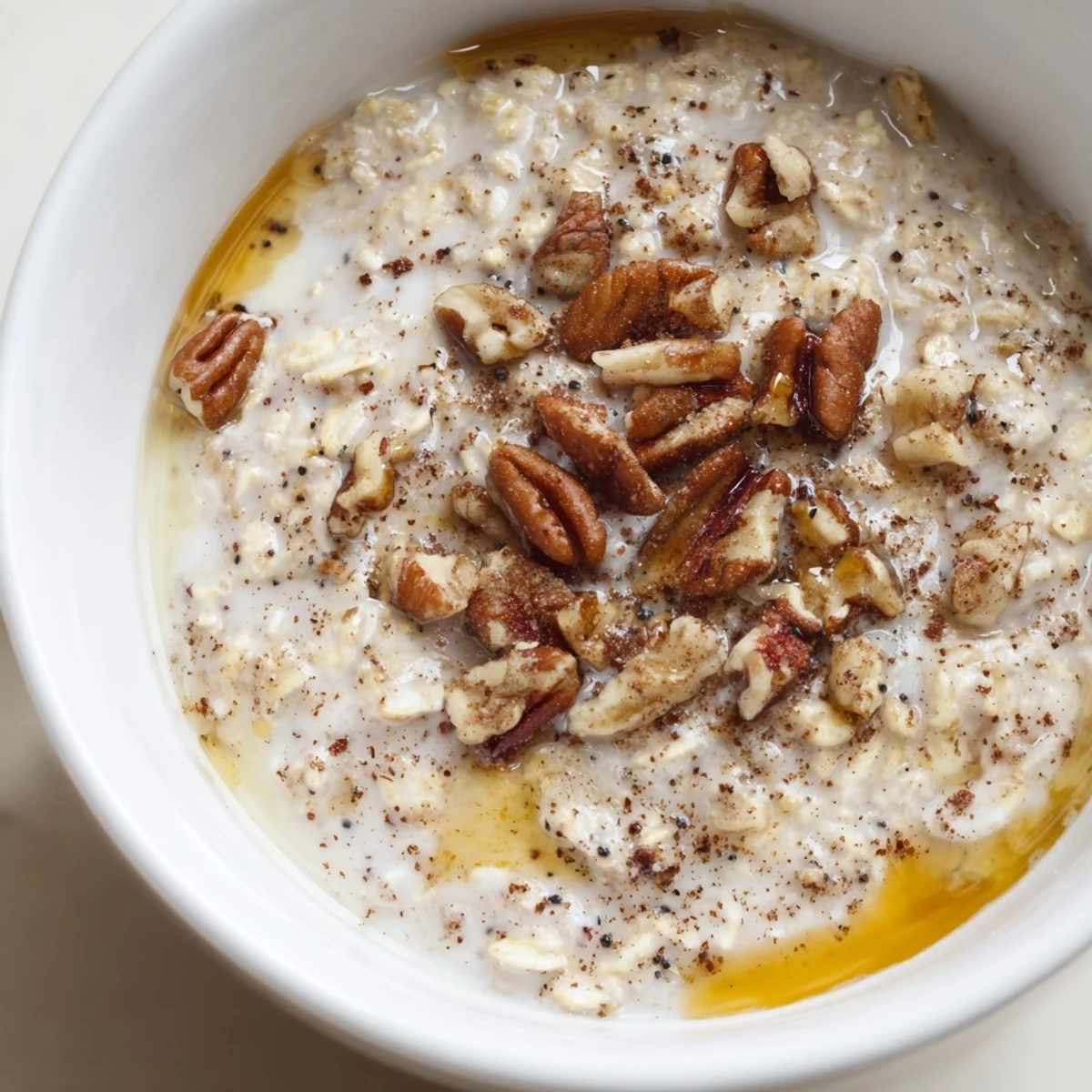 Start your morning with a bowl of creamy, chilled oats soaked overnight with pure maple syrup, fragrant cinnamon, and vanilla. The texture becomes perfectly thick and pudding-like while the flavors meld together beautifully in the refrigerator. Top generously with chopped pecans for satisfying crunch, plus an extra drizzle of maple syrup and dusting of cinnamon. This make-ahead breakfast serves two and stays fresh for days, making busy mornings effortless. Customize with your favorite milk, swap in walnuts or almonds, or add fresh berries for extra sweetness.