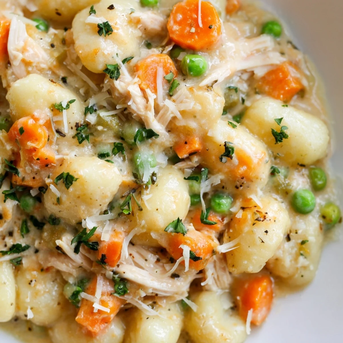 - Gently stir in the uncooked gnocchi, shredded chicken, and frozen peas. Make sure the gnocchi are mostly submerged in the sauce, then cover and simmer for 10 to 12 minutes. Stir occasionally to prevent sticking, and when the gnocchi are tender and floating freely, the sauce should have thickened beautifully.